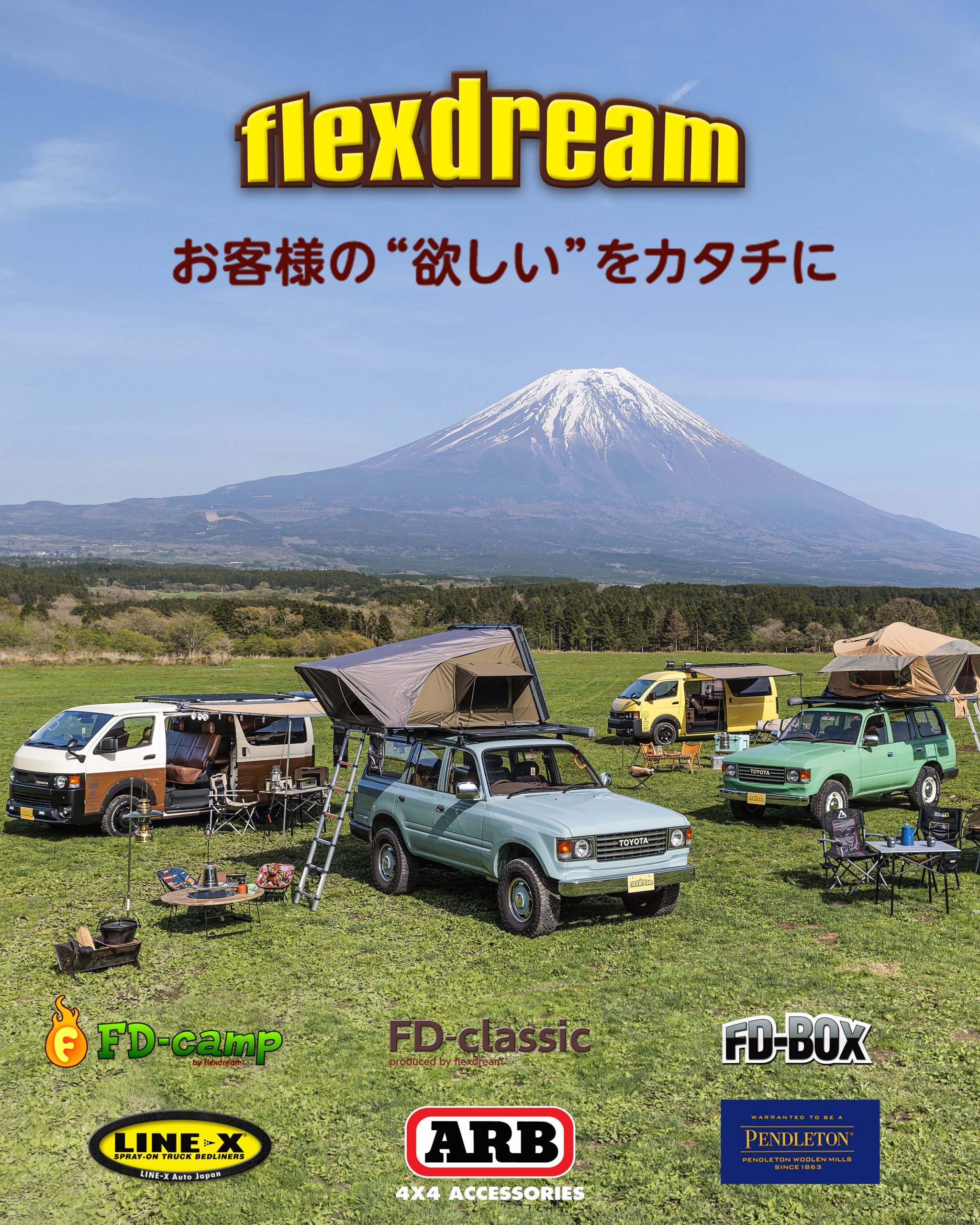 ランクル・ハイエース・USトヨタ各車・キャラバン・デリカD:5・トライトンなど…新車・中古車をベースにアウトドアシーンにピッタリなカスタムコンプリートカーを販売しています!