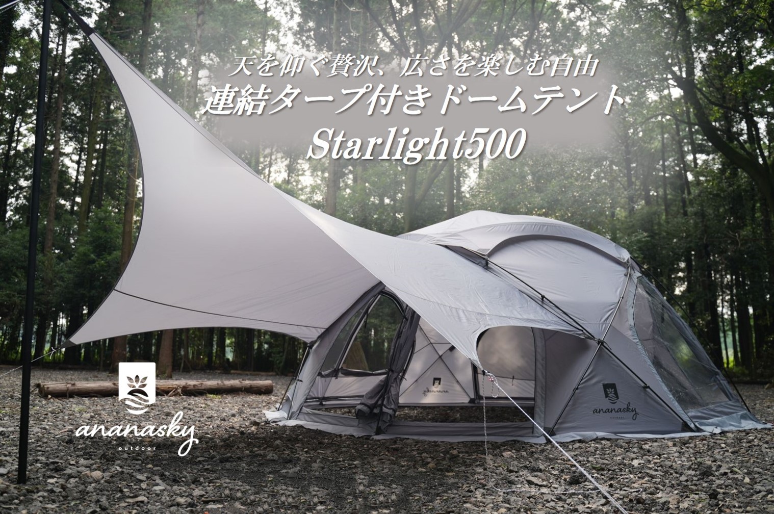 専用の連結タープ付き大型ドームテント!ドームテントの不満を解消したオールインワンモデルです。天井には大きな天窓があり、夜空が広がります!!