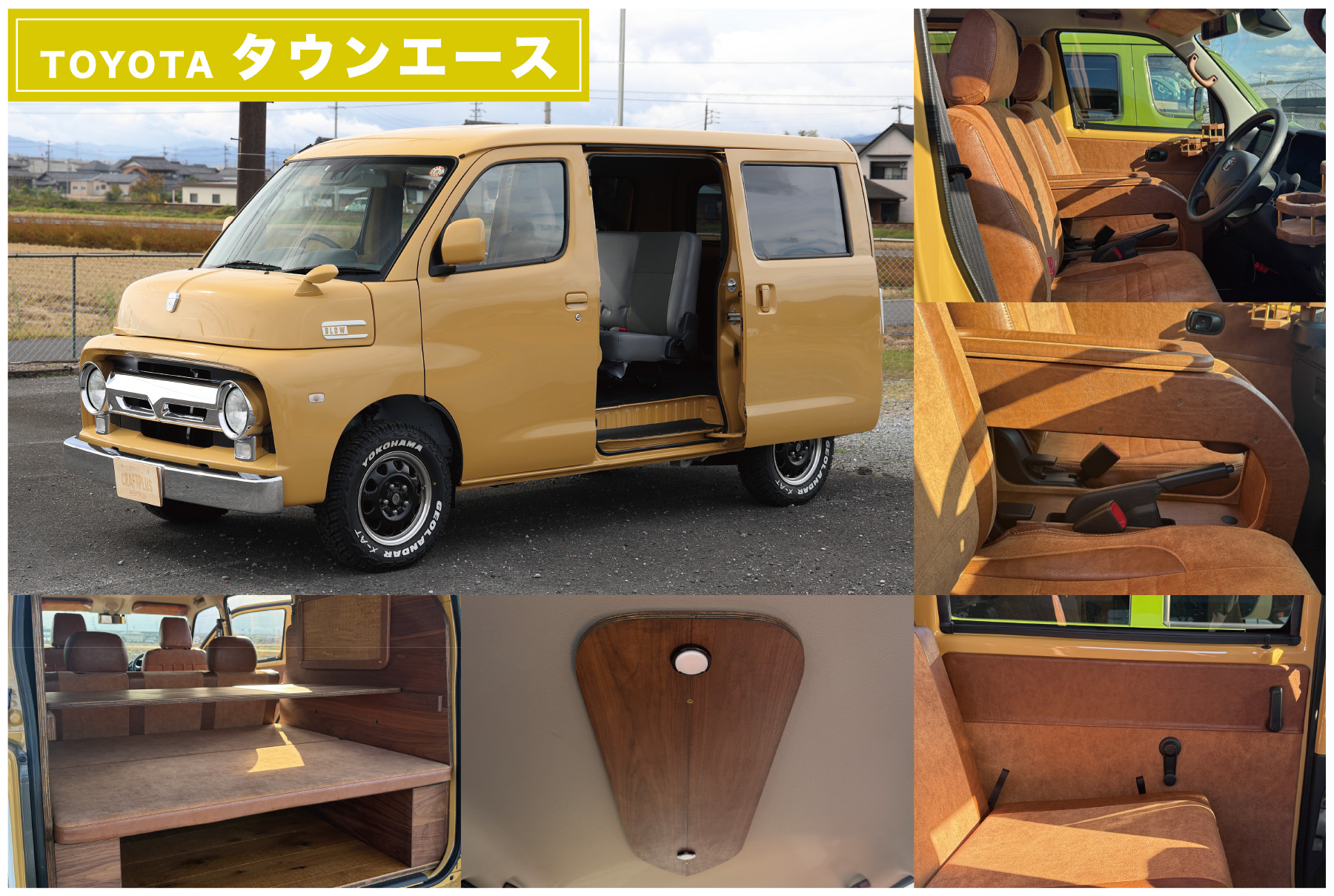 クラシックなエアロキットが目を引くタウンエース。木の温もりあふれる内装とゆとりある空間設計で、車内をくつろぎの空間へと仕上げました。ベッドスペースも充実し、旅先でも快適に過ごせる仕様に。細部までこだわった質感と実用性で、日常からそのまま旅へ出られる一台です。